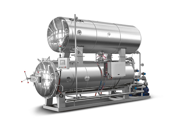 3、淋水式杀菌:这种方式是采用喷嘴或喷淋管将热水喷到食品上,杀菌过程是通过装设在杀菌锅内两侧或顶部的喷嘴中,喷射出雾状的波浪型热水至食品表面,所以不但温度均匀无死角,而且升温和冷却速度迅速,能全面、快速、稳定的对锅内产品进行杀菌,特别适合软包装食品的杀菌。