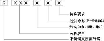 例如: G300---III----B表示不锈钢夹层蒸气锅300L;固定式;第一次设计;要求锅底放料,加高撑脚。